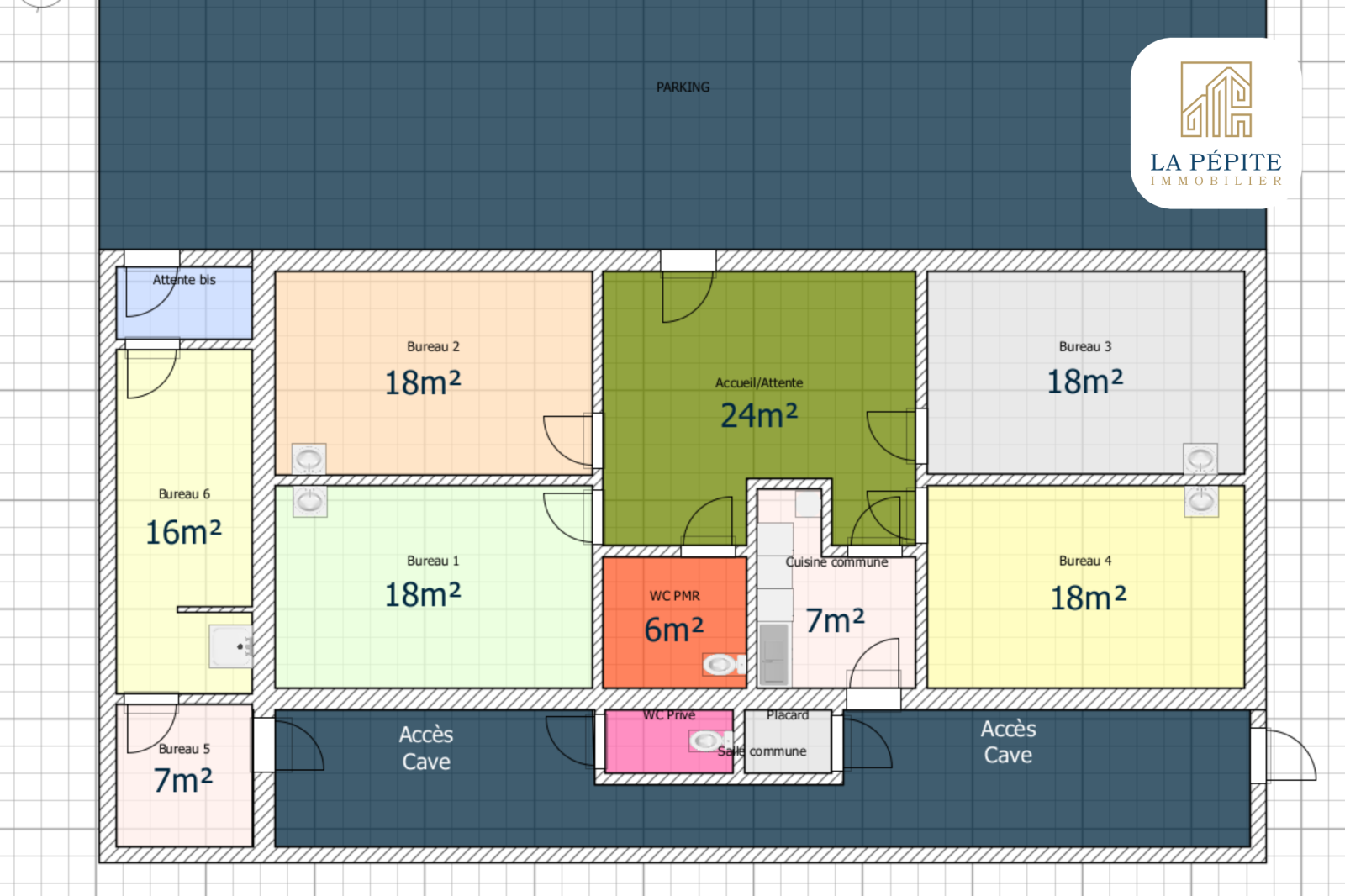 - Une première partie accueille une grande salle d'attente de 24m² avec WC PMR de 6m².