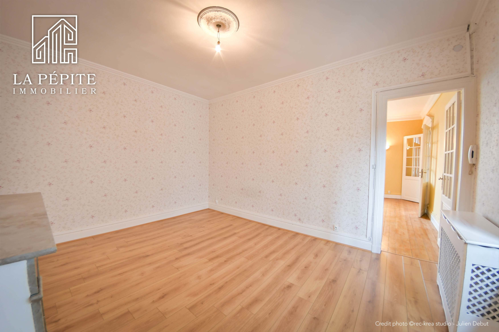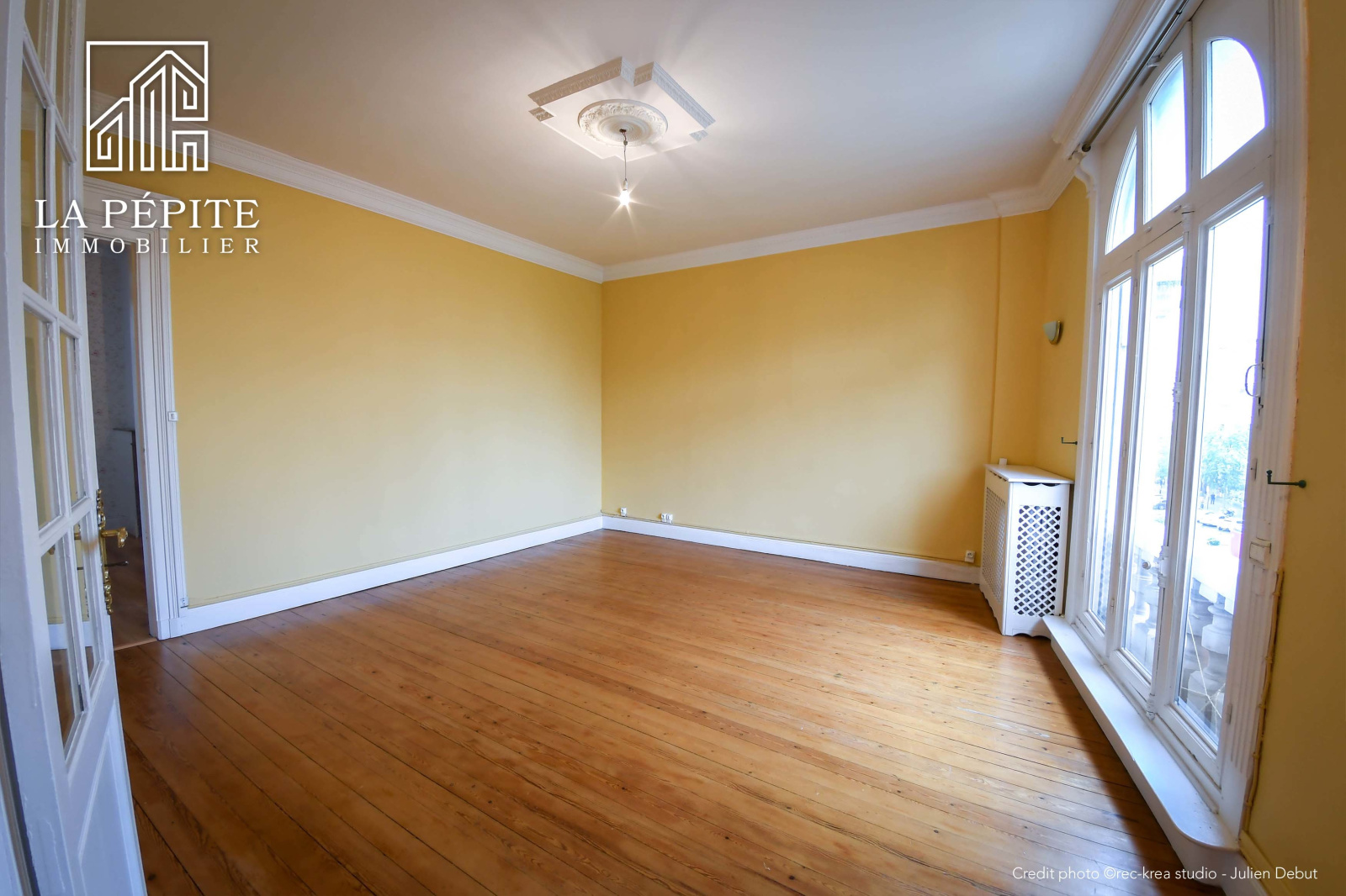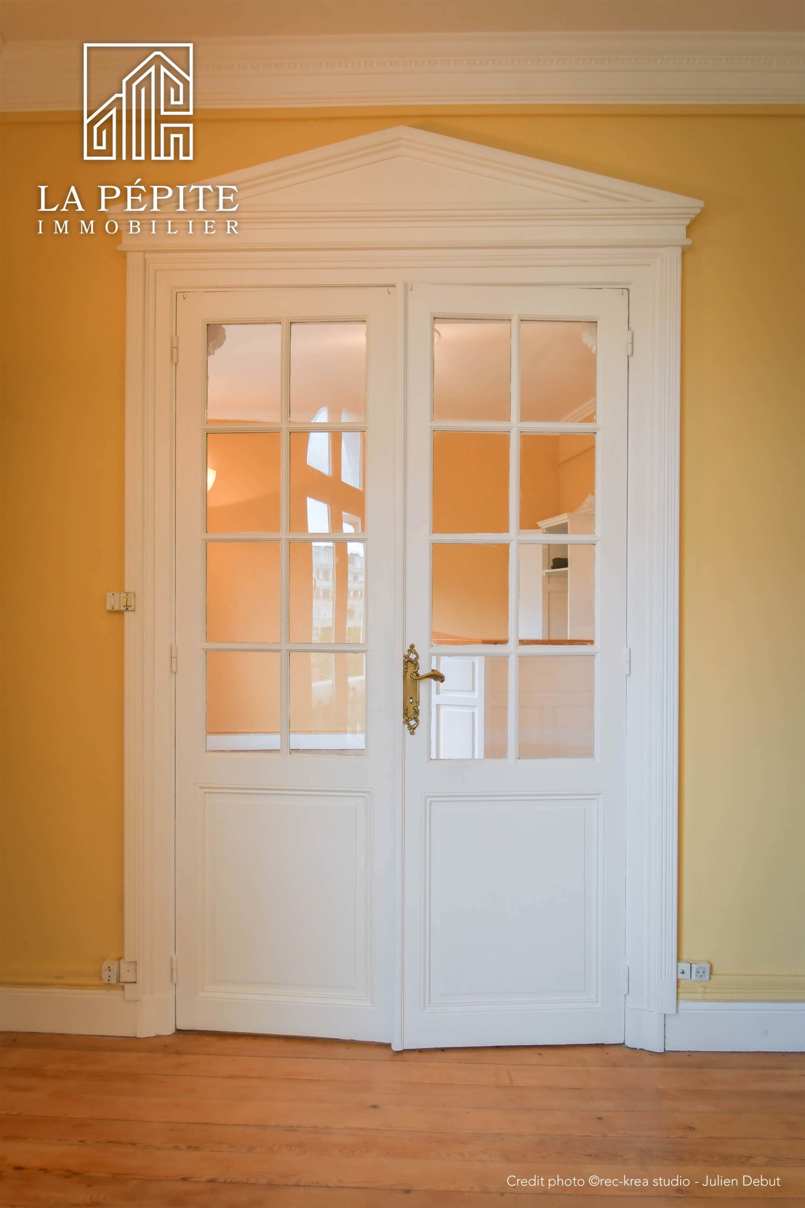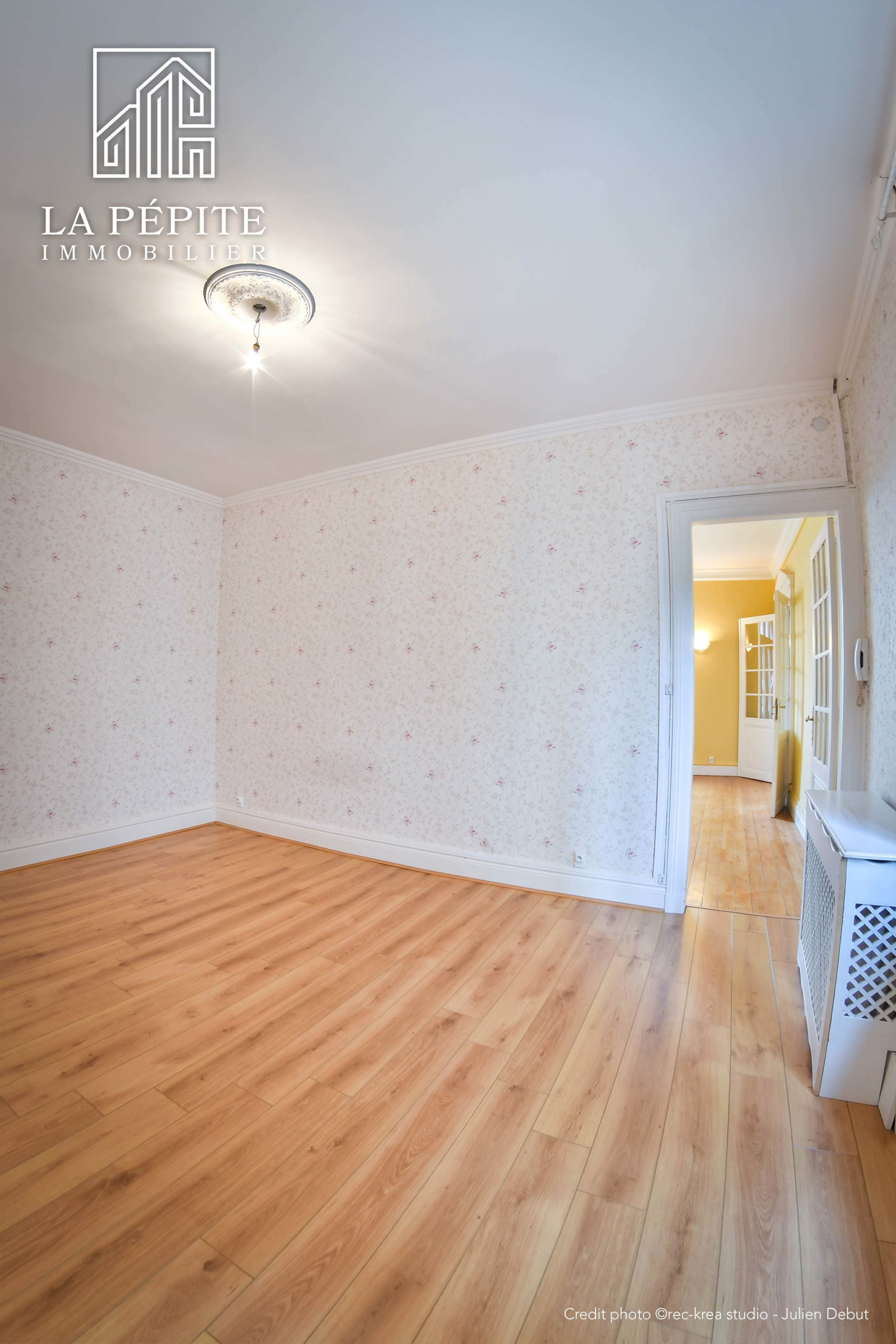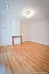 Tout l'appartement possède un sol en parquet massif, il y a une cheminée en marbre et des moulures.