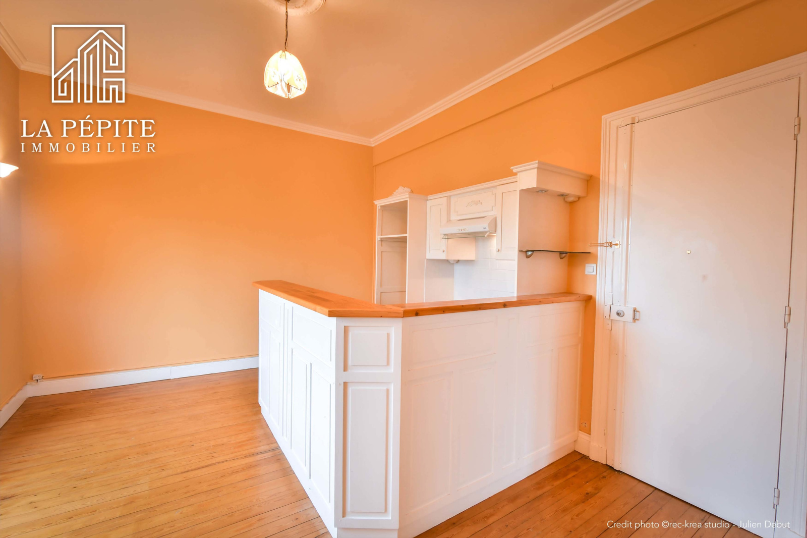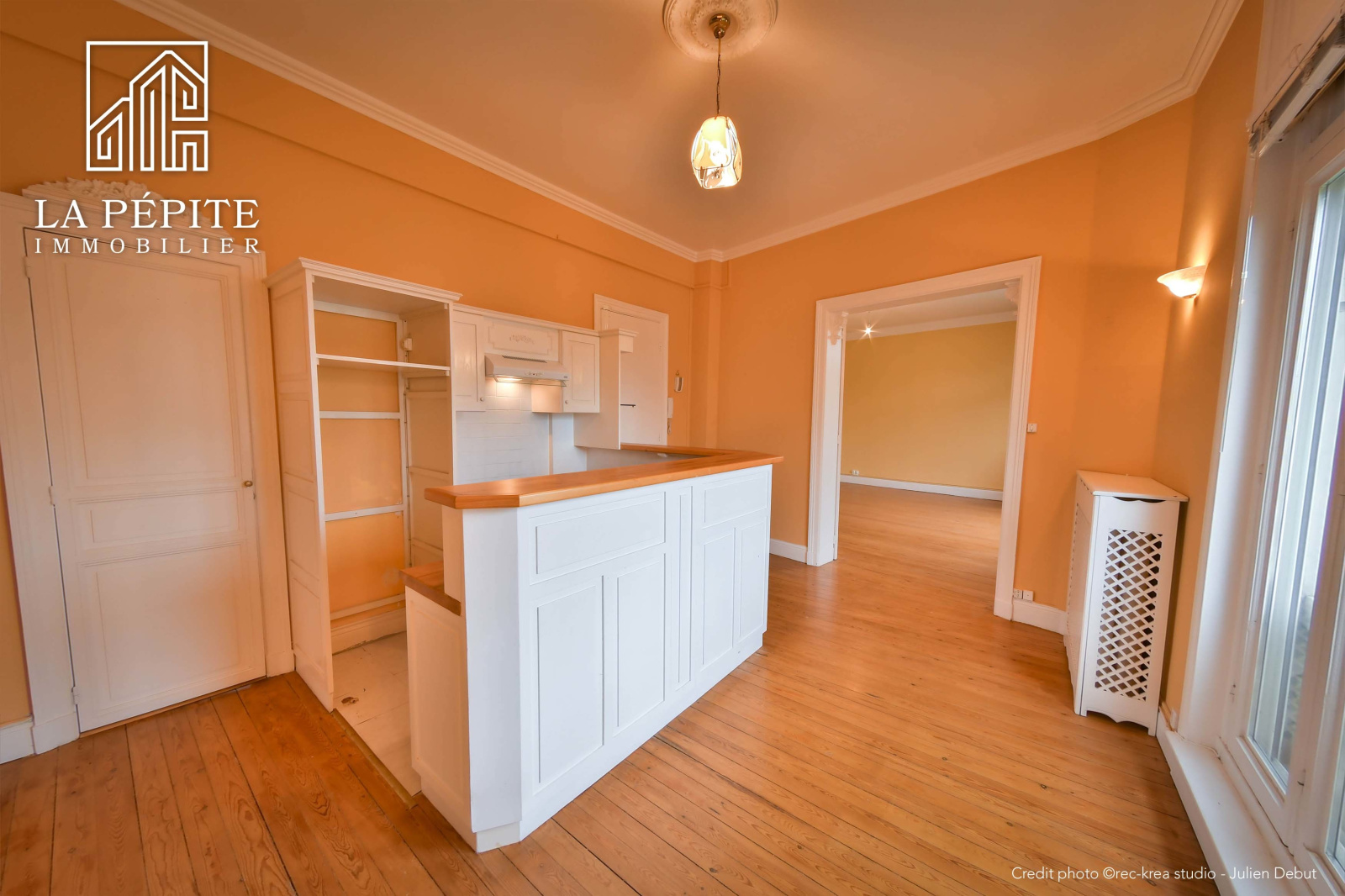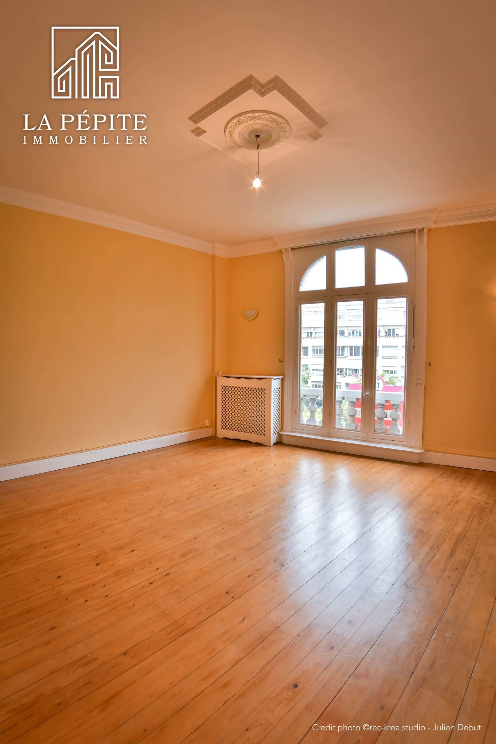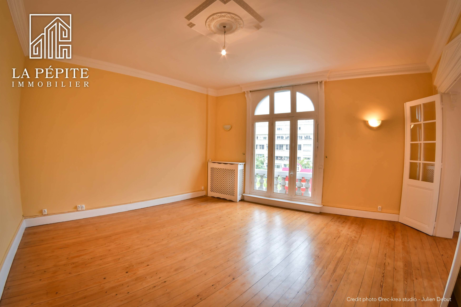 Tout l'appartement possède un sol en parquet massif, il y a une cheminée en marbre et des moulures.