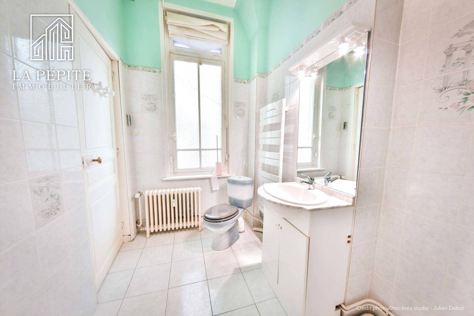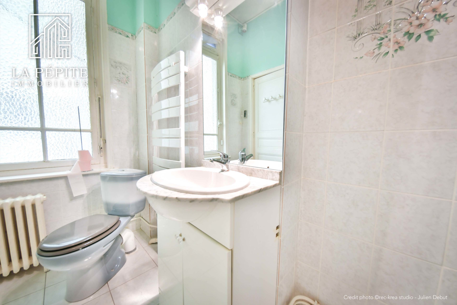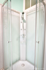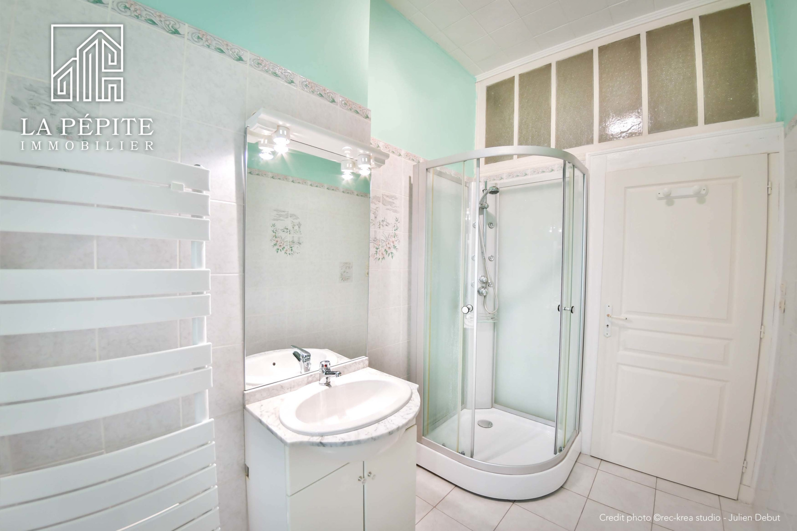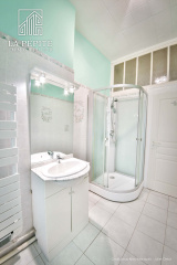 Salle de bain de 5m2 avec une douche, un meuble vasque et un WC.