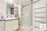 La salle de douche est équipée d'un lavabo et d'une douche d'angle.