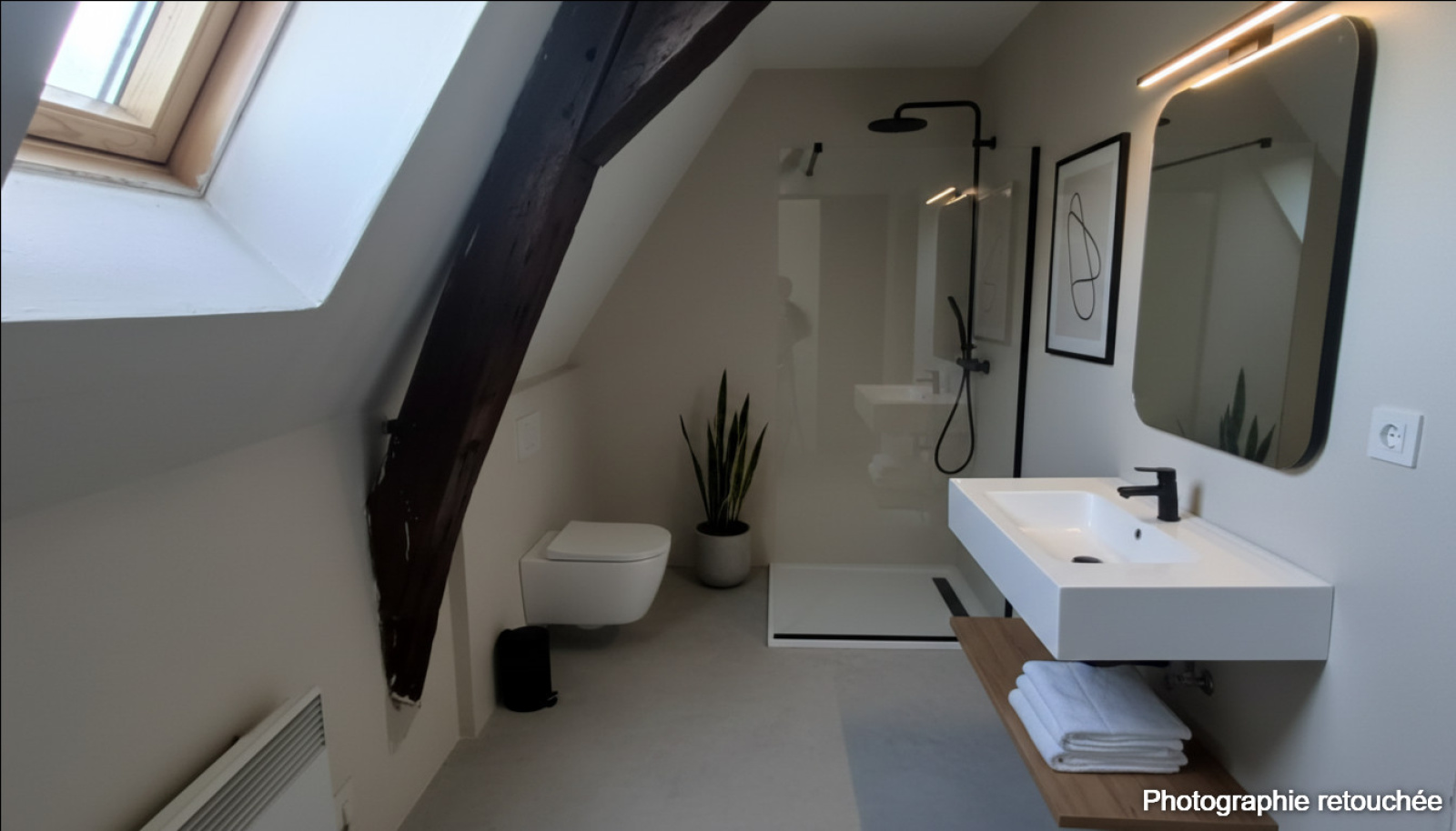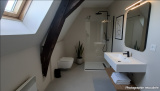 Au deuxième étage une chambre avec une salle de bain et WC.