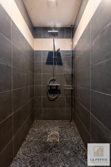 Une salle de bain attenante à la chambre, avec sol en teck et douche carrelée.