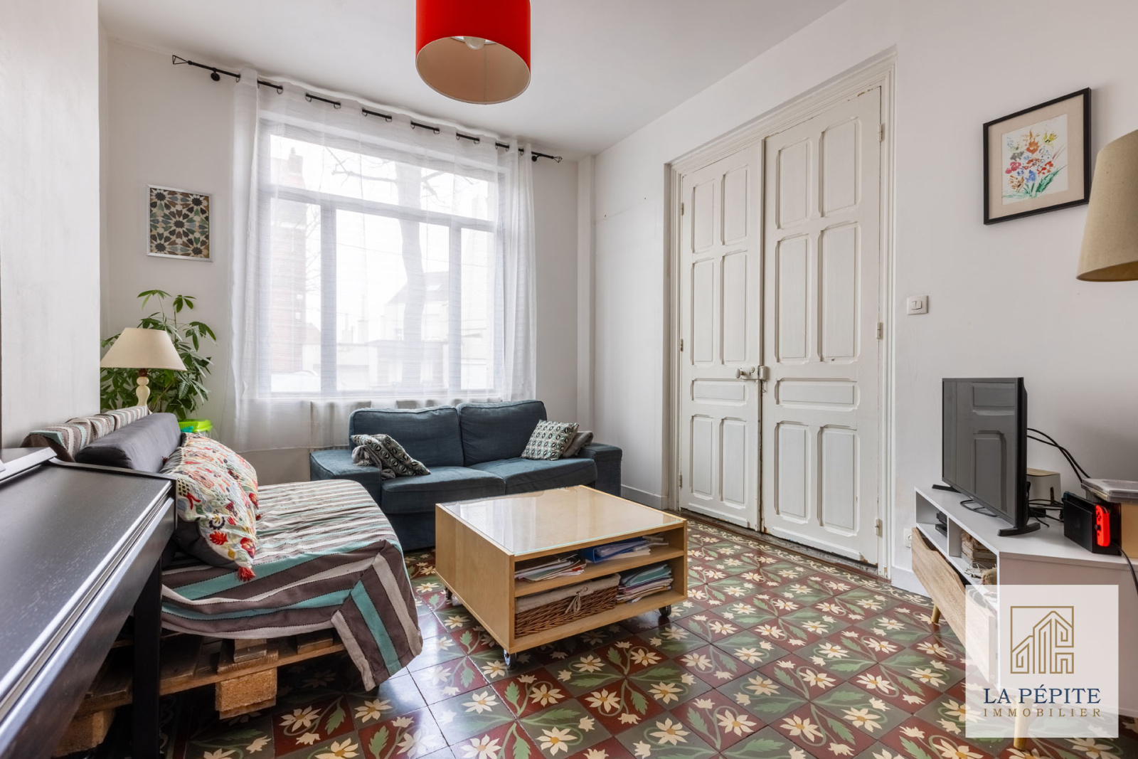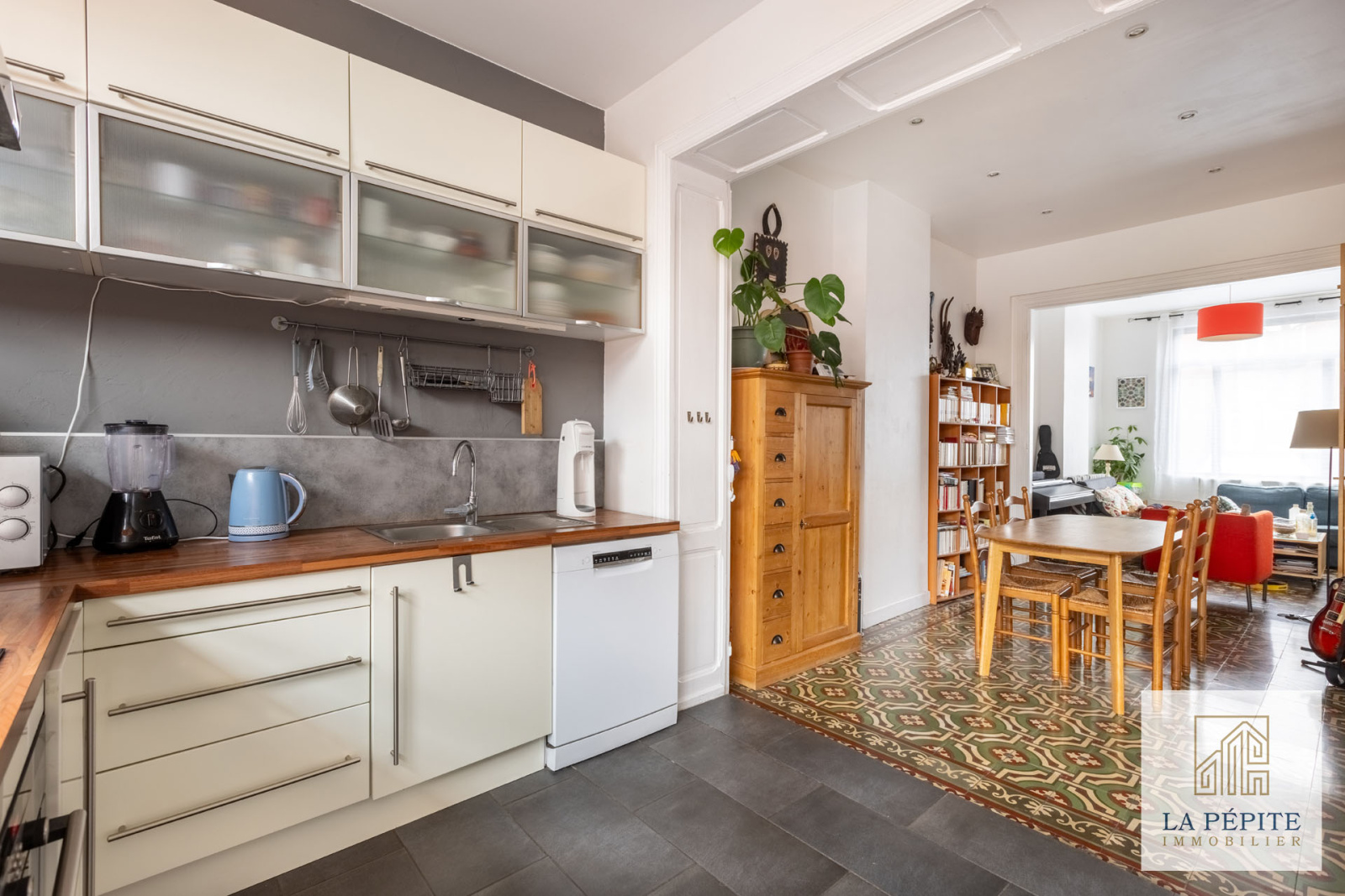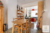 Au rez-de-chaussée, l’entrée dessert un salon lumineux, une salle à manger conviviale dotée d'une belle hauteur sous plafond et d'un charme authentique avec ses carreaux de ciment au sol.