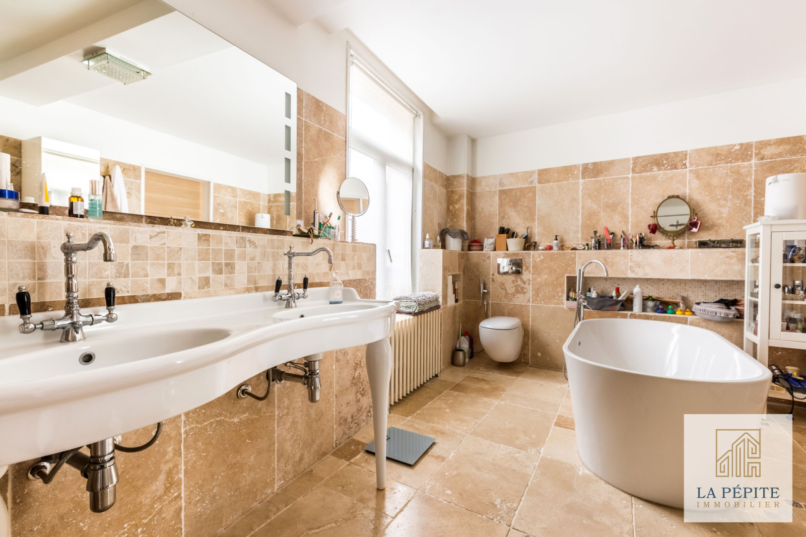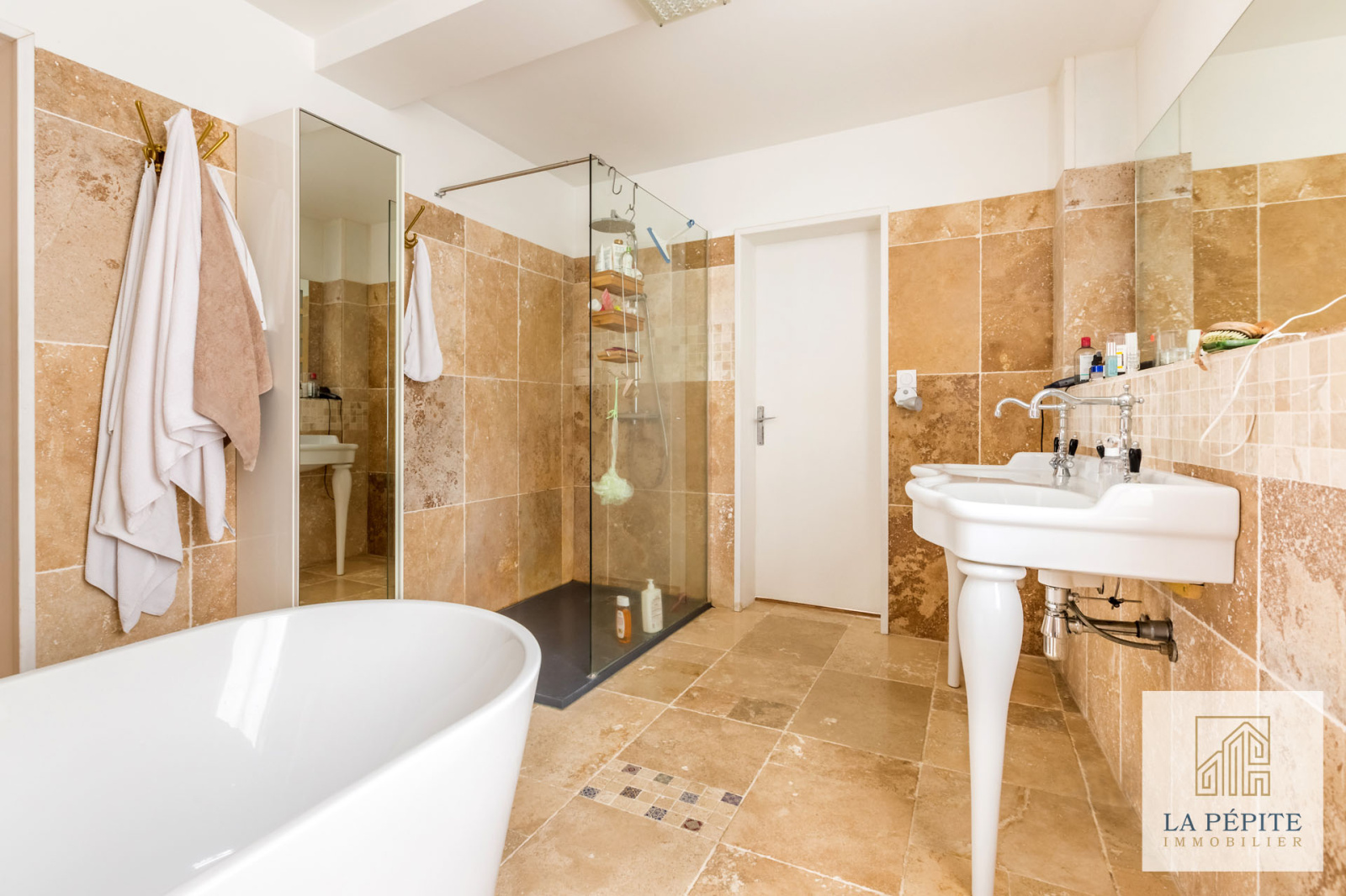 À l'étage, baigné de lumière naturelle, vous apprécierez la salle de bain comprenant une baignoire et une douche à l'italienne. Vous disposerez de quatre chambres, chacune offrant entre 13 et 20 m2 d'espace, un dressing, et une terrasse d'environ 35 m2, idéale pour profiter du plein air en toute intimité.