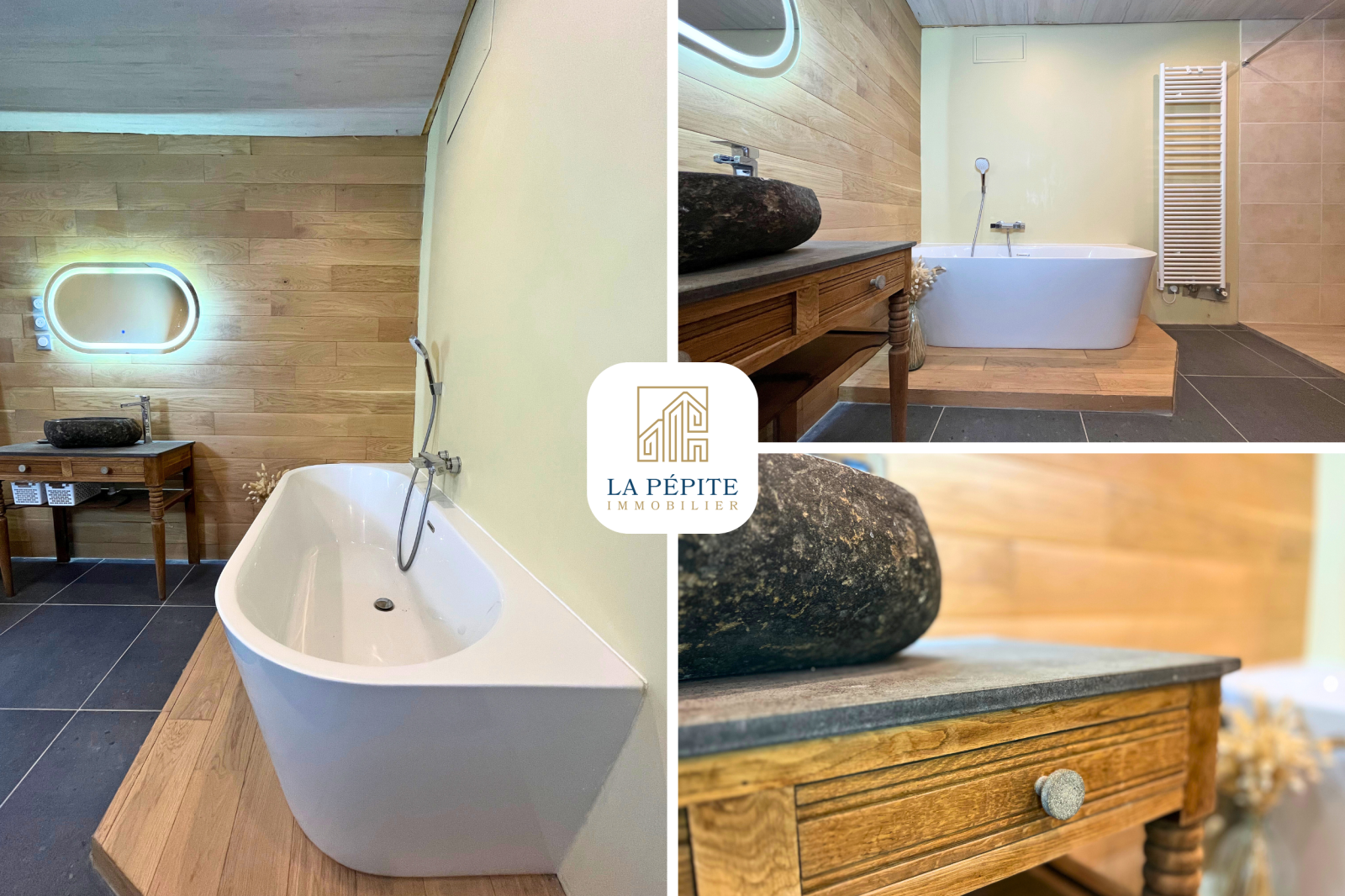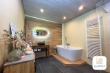 La salle de bain, chaleureuse et spacieuse (10m²) apporte dans un subtil mélange de bois, de pierre et de fleurs séchées tout l'espace nécessaire pour un meuble vasque, une baignoire et une douche à l'italienne.