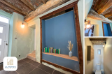 Au rez-de-chaussée, on arrive par une belle entrée avec des voutins en briques et des poutres en chêne. Le charme opère. Le ton est donné, l'atmosphère est calme et douce. Patine, Pastel et Pierres bleues.