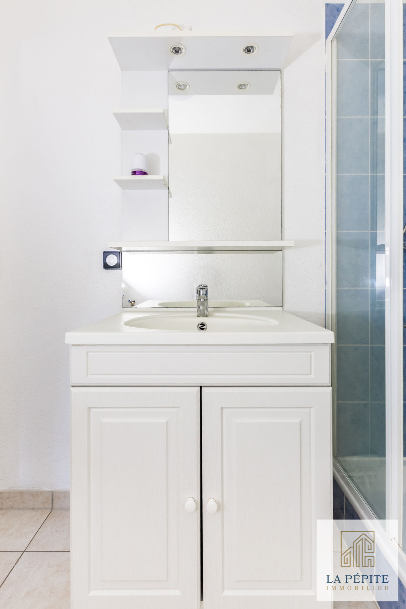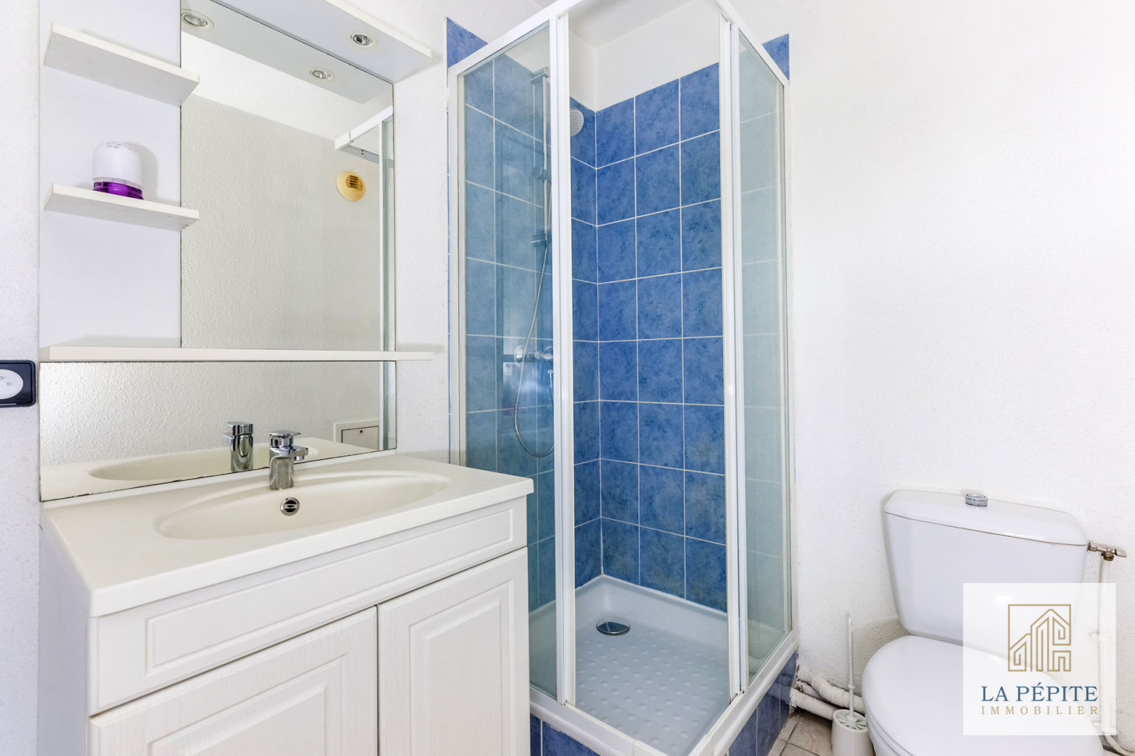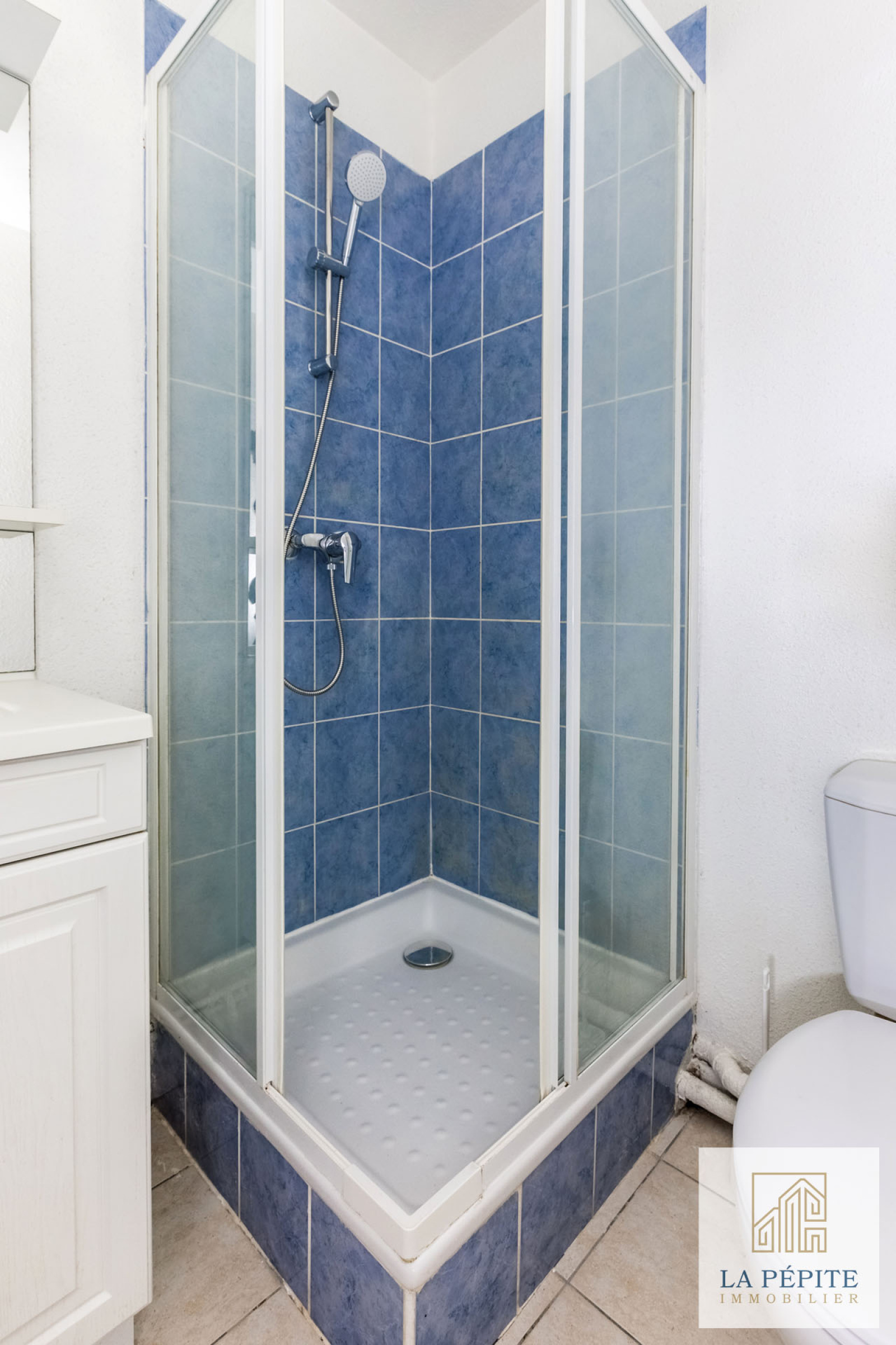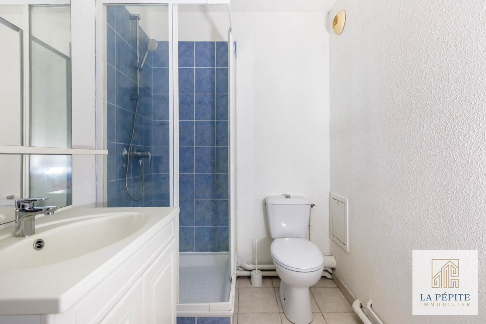 La salle de bains est équipée d'une douche, un lavabeau et un WC. La robinetterie est neuve.