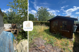 On accéde au jardin délimité par des haies. Un chalet de jardin, une petite terrasse avec barbecue, tout est là, il faut juste se l'approprier.