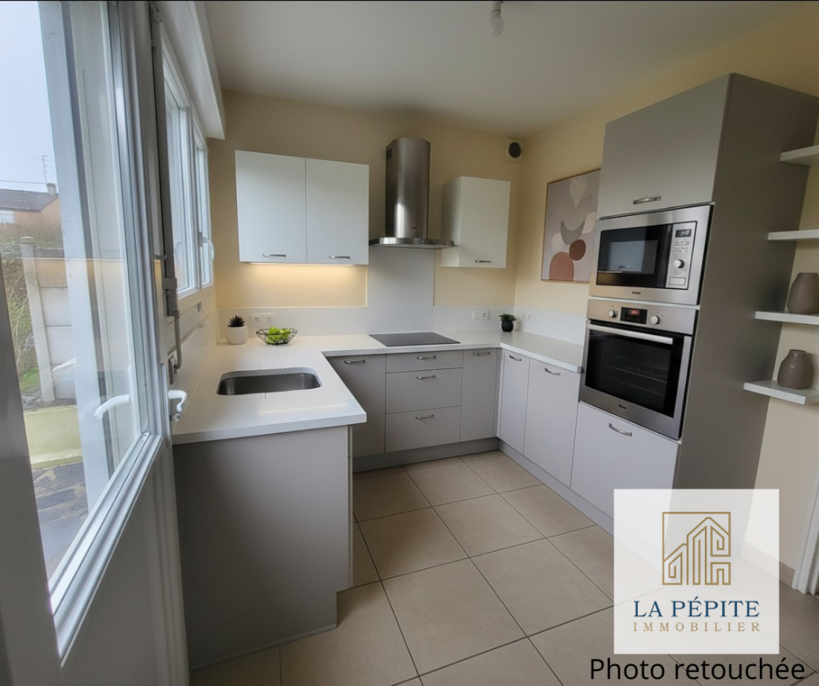 La cuisine donne sur un terrain d’environ 140 m², parfait pour créer un espace extérieur agréable (terrasse, jardin, coin détente…).