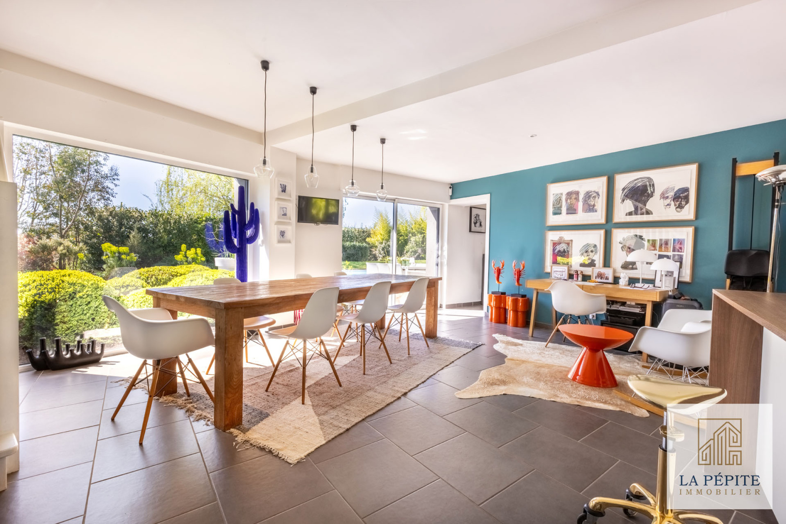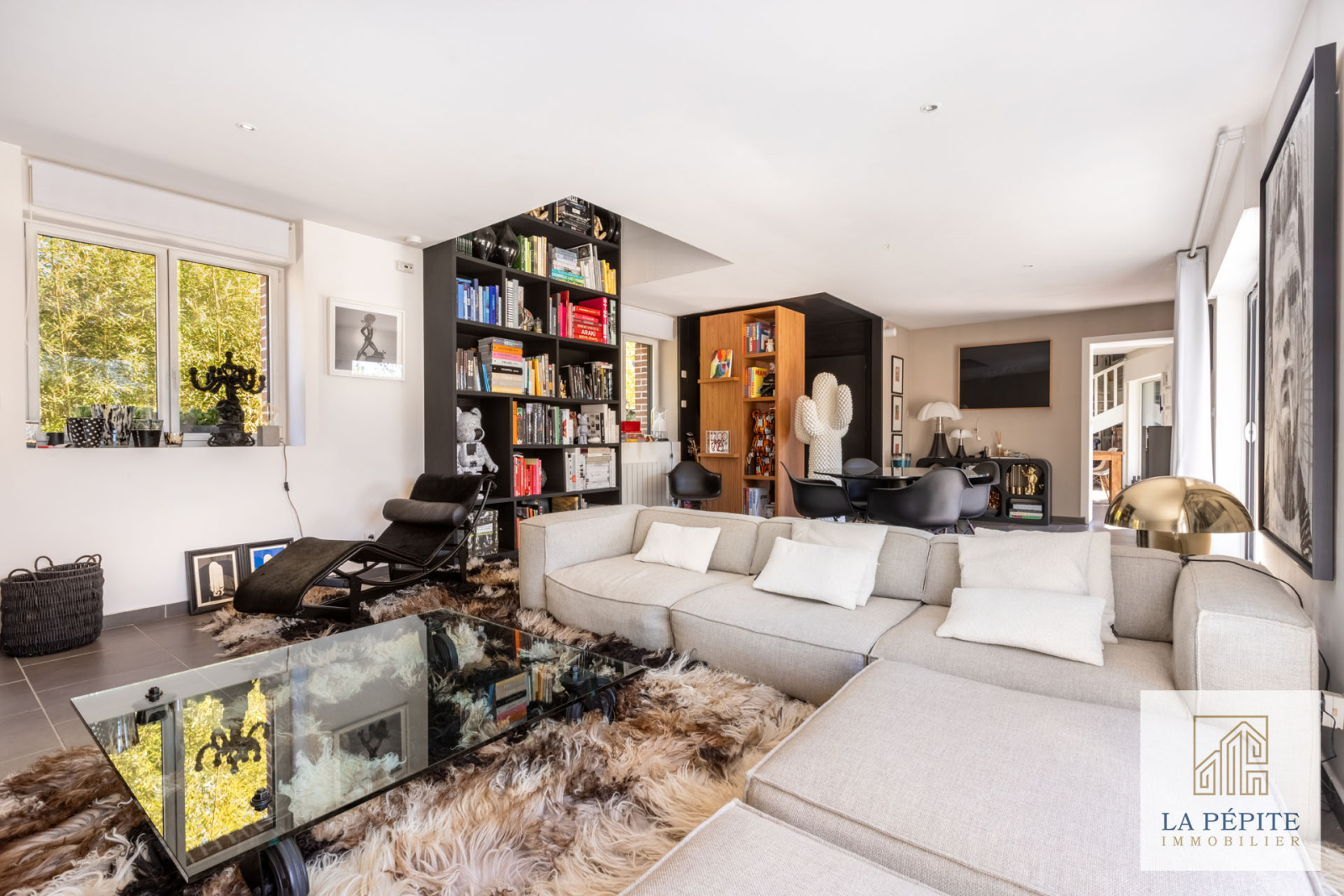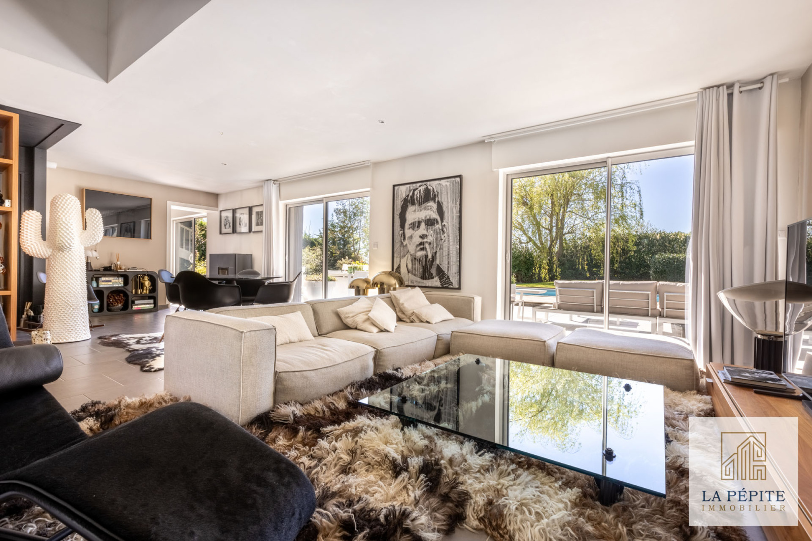 - Un vaste salon baigné de lumière, ouvert sur la terrasse et la piscine
