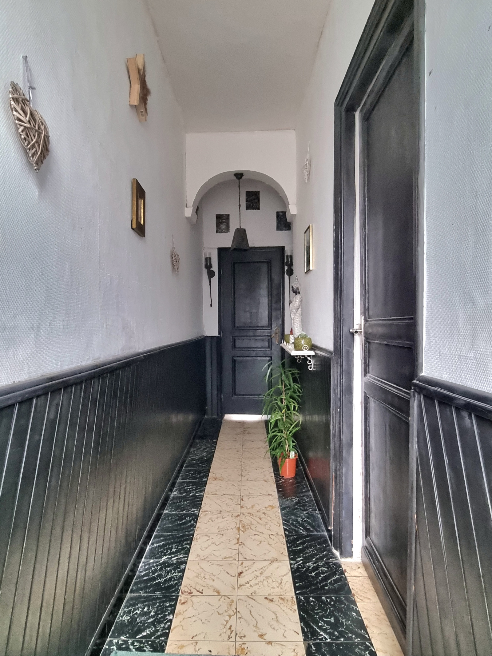 Dotée d'une double distribution, avec d'un côté l'habitation principale et de l'autre, dans une rue parallèle, un garage avec passage latéral, ce bien peut vous offrir de multiples possibilités. Il dispose au rez-de-chaussée d'un couloir d'entrée, d'une salle à manger avec belle hauteur sous plafond de 15m2, d'un salon de 13 m2, d'une cuisine non équipée et d'une buanderie avec WC. Vous trouverez également une pièce d'environ 5 m2 actuellement non utilisée pouvant faire office de dressing ou encore être utlisée dans le but d'agrandir l'espace salon.