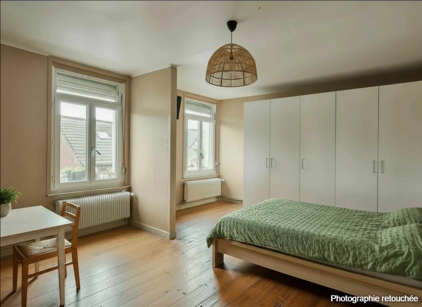 A l'étage, le palier dessert d'un coté, une chambre traversante avec accès à la salle de bain équipée d'une vasque et d'une baignoire. De l'autre coté, une très grande chambre de 20m2 pouvant être divisée en deux de manière à obtenir une troisième chambre. Possibilité également de créer un couloir distribuant ces deux potentielles chambres ainsi que de créer un second accès à la salle de bain.