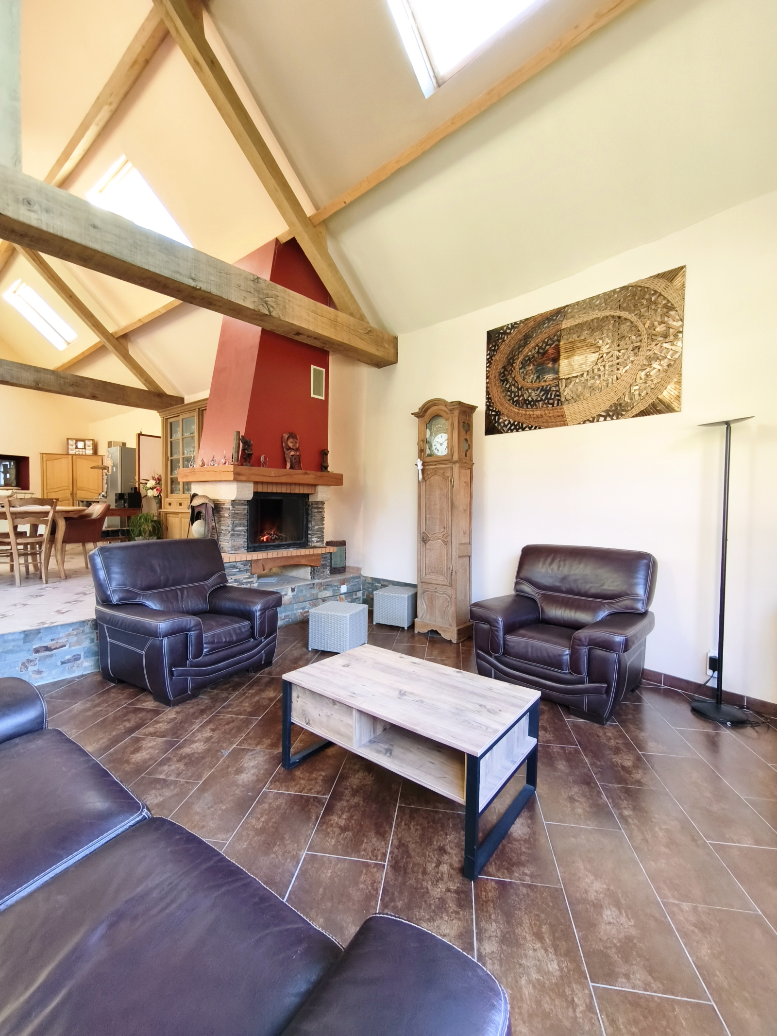 Le salon plus intimiste et parfaitement délimité par deux marches en contre bas avec une grande fenetre sur le jardin et un insert à bois double foyer.