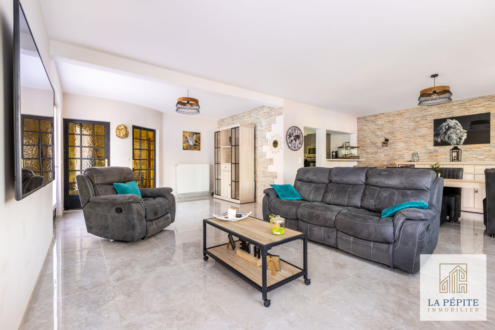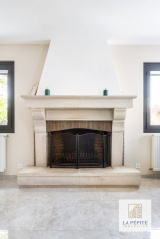 Le beau séjour séduit par ses multiples ouvertures, son imposante cheminée cocooning et son atmosphère chaleureuse.