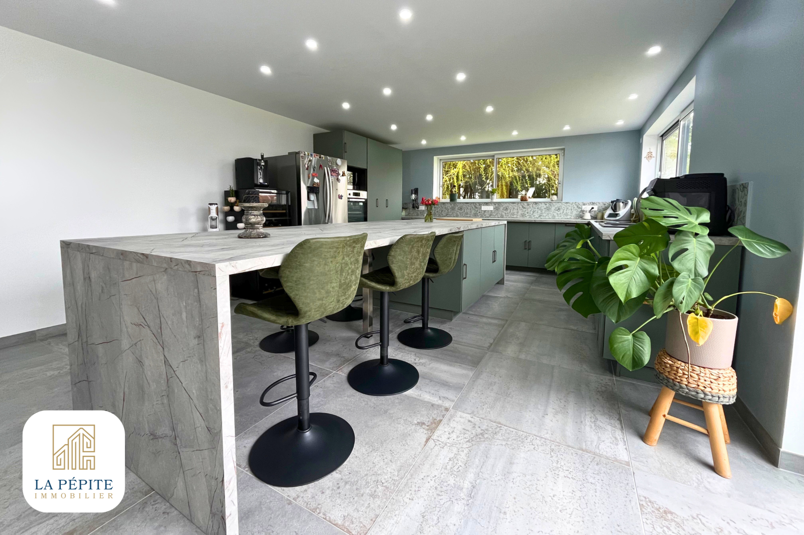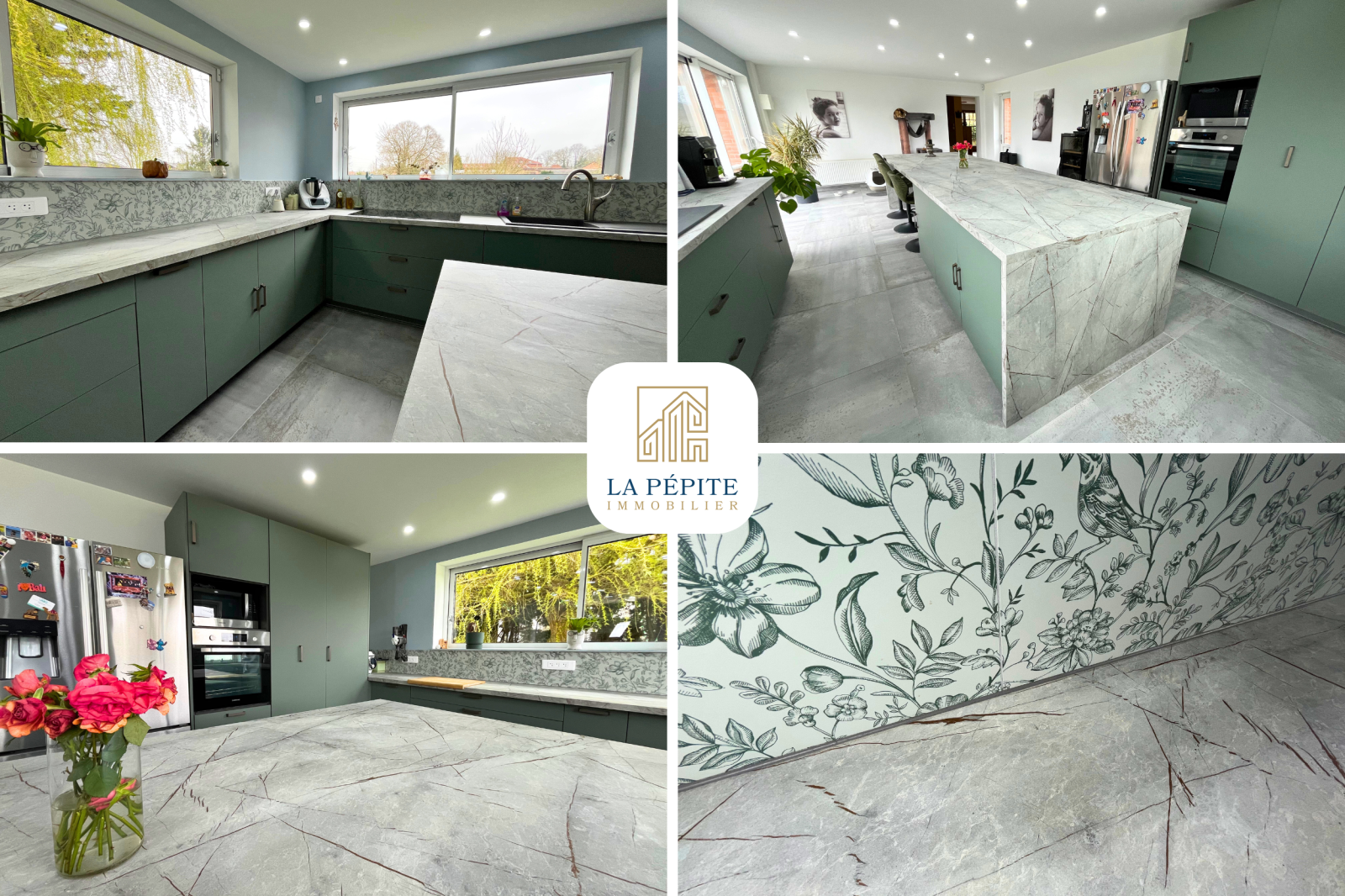 Allez, vous l’attendiez, voici l’extension : 36m² dédiés exclusivement à la cuisine équipée. Une belle cuisine en U, très lumineuse, sublimée par un îlot vertigineux avec une partie repas pouvant accueillir 6 adultes sans avoir besoin de se serrer.