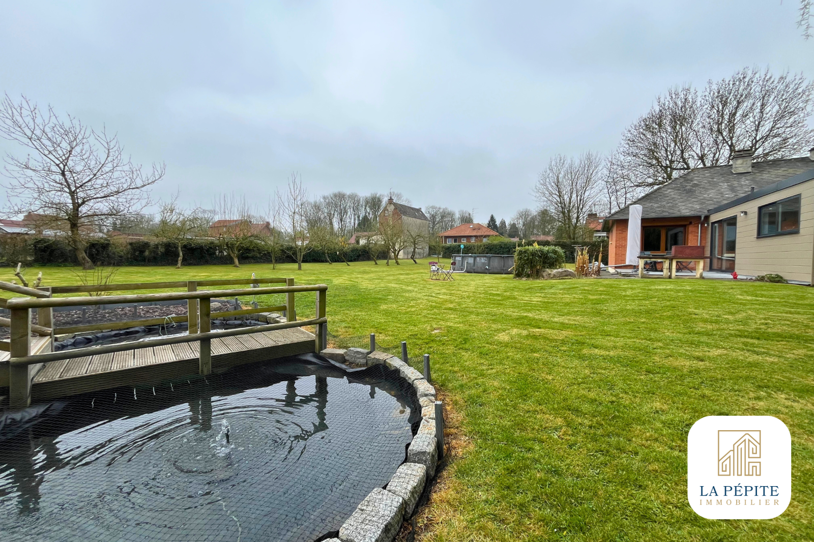 Sur ce terrain : une villa des années 70, rénovée et agrémentée d’une extension récente, un double garage de 50m² avec carport, un abri de jardin et deux terrasses : une en nord-est pour les petits déj’ printaniers et une orientée plein sud pour l’apéro : on y accède par un petit ponton surplombant un joli bassin. En somme, c’est un étang du Pont Rouge miniature à domicile.