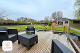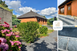 D’un côté, la baie vitrée donne sur une terrasse de 20m² environ avec un barbecue et une belle vue sur le terrain.