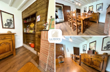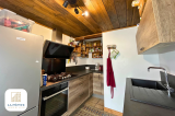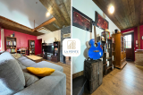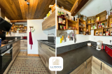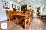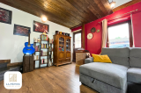 Par l’autre côté, on traverse la cuisine équipée de 2017 qui conserve ses équipements, pour arriver dans le grand salon avec une cheminée et une mezzanine. La pièce a du volume et offre une mezzanine avec couchage.