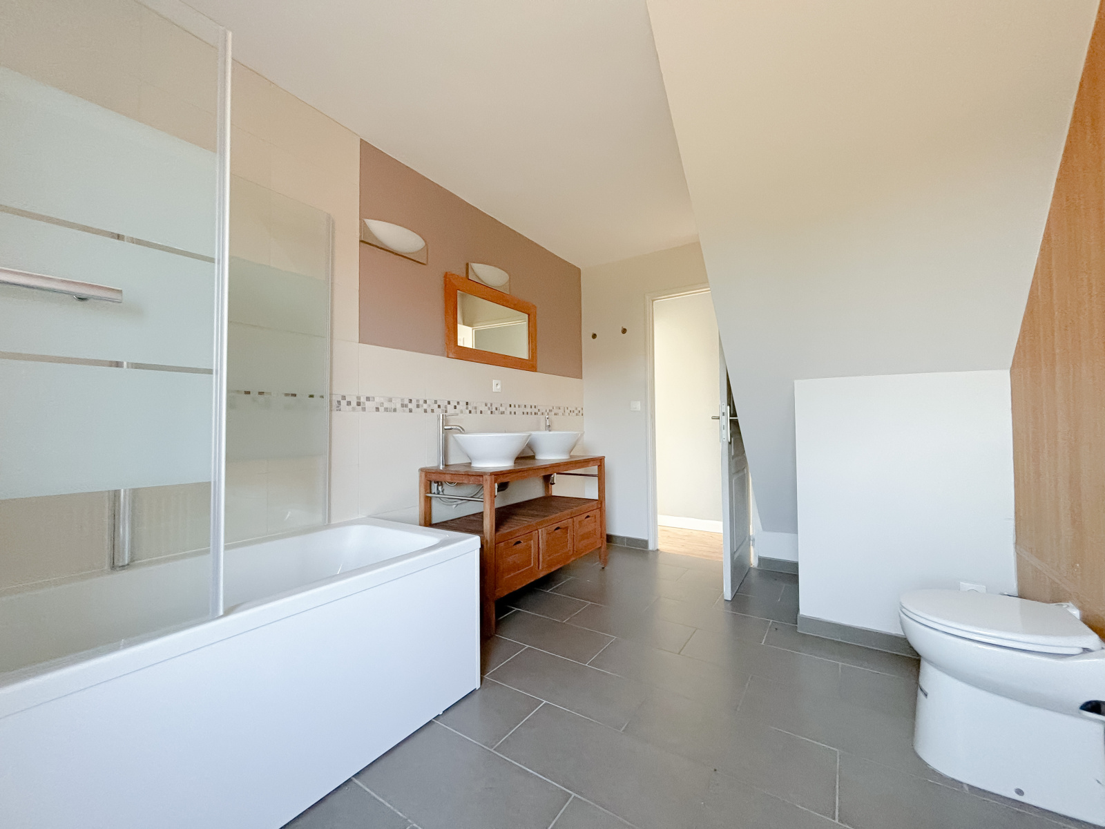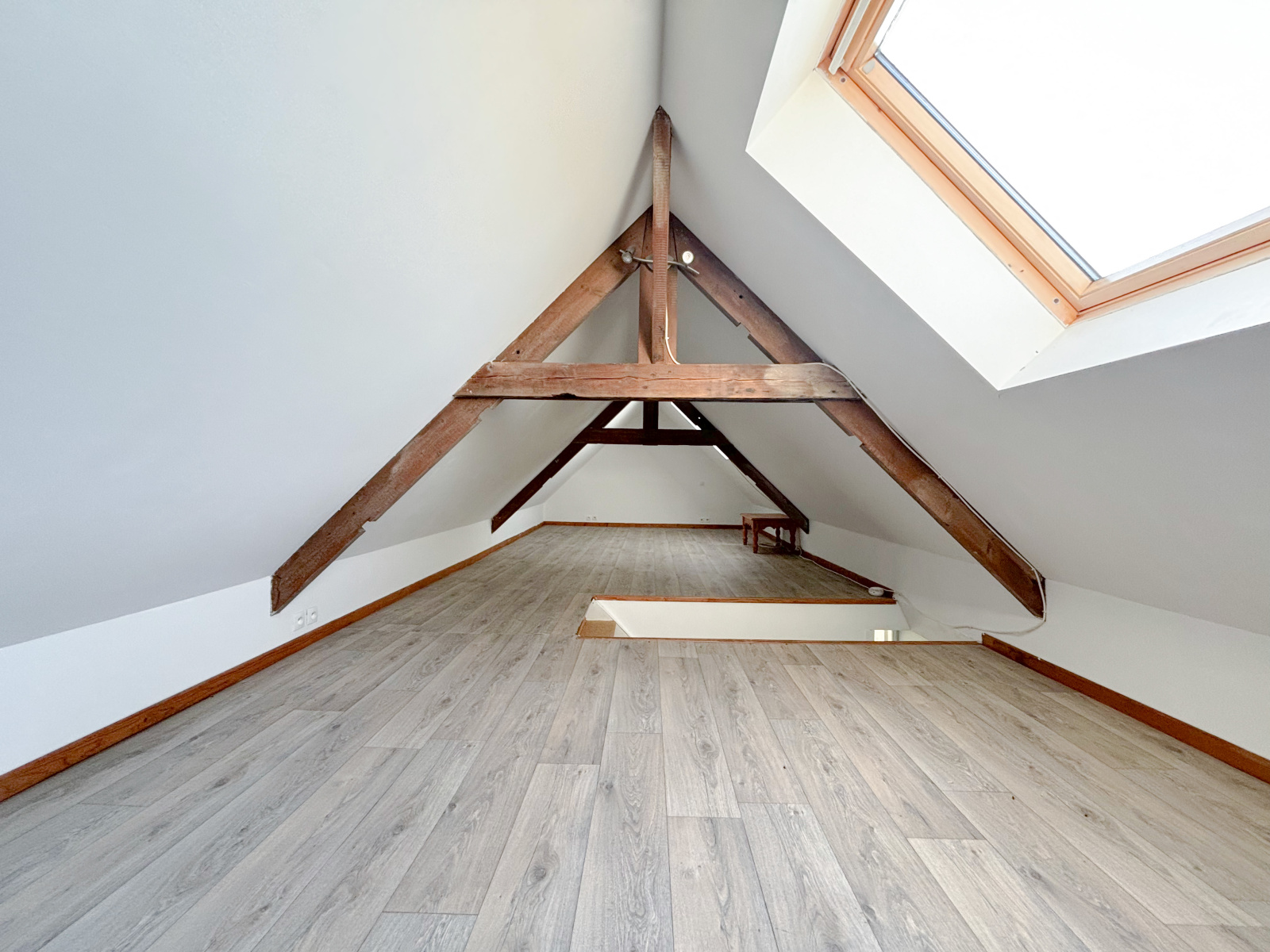 Au premier, une jolie chambre de 12,5m2, puis une seconde avec vue sur les champs, de 18m2. Vous disposerez également d'une salle de bains avec baignoire, double vasque et un sani-broyeur. Au second, une dernière grande chambre, ou espace de jeux avec poutres apparentes.