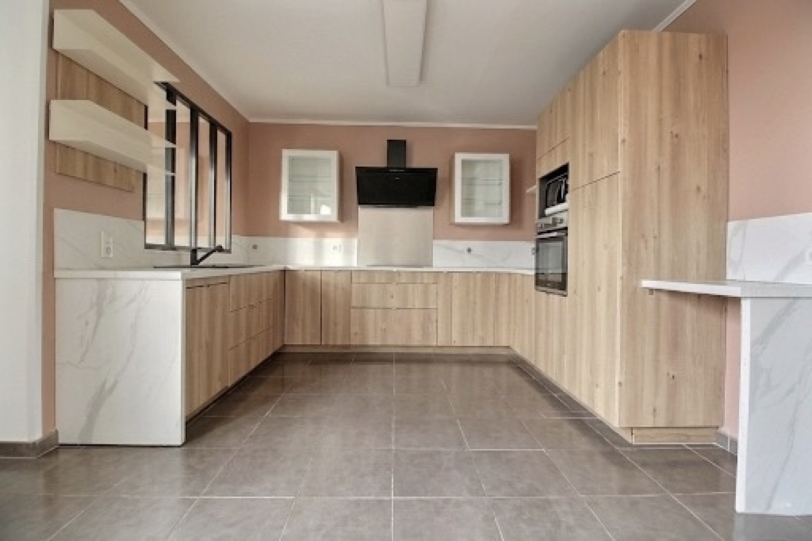 Elle s’ouvre sur une cuisine entièrement équipée d’environ 12 m², créant un espace convivial et fluide.